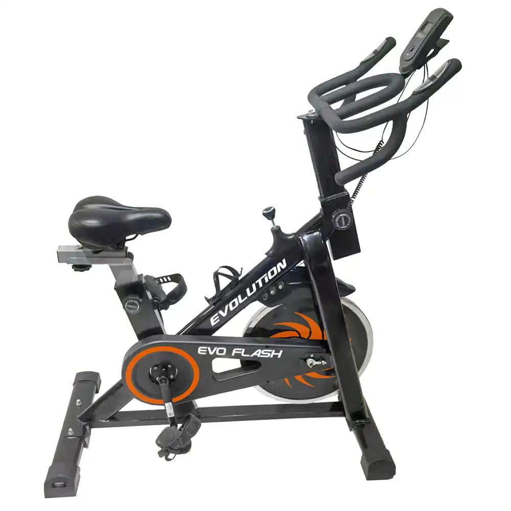 La bicicleta de spinning EVO FLASH está diseñada para entrenamientos intensos y sin distracciones: su volante delantero de 8 kg y sistema de transmisión por banda garantizan un pedaleo suave y silencioso, mientras su resistencia por fricción te permite ajustar la intensidad a tu ritmo. Con pedales seguros, asiento ergonómico con ajuste vertical y horizontal, y manillar adaptable, se ajusta completamente a tu cuerpo. Su monitor te muestra tiempo, velocidad, distancia y calorías para que lleves el control de tu progreso. EVO FLASH es la aliada perfecta para llevar el cardio al siguiente nivel. ¡Pedalea hacia tus metas hoy!