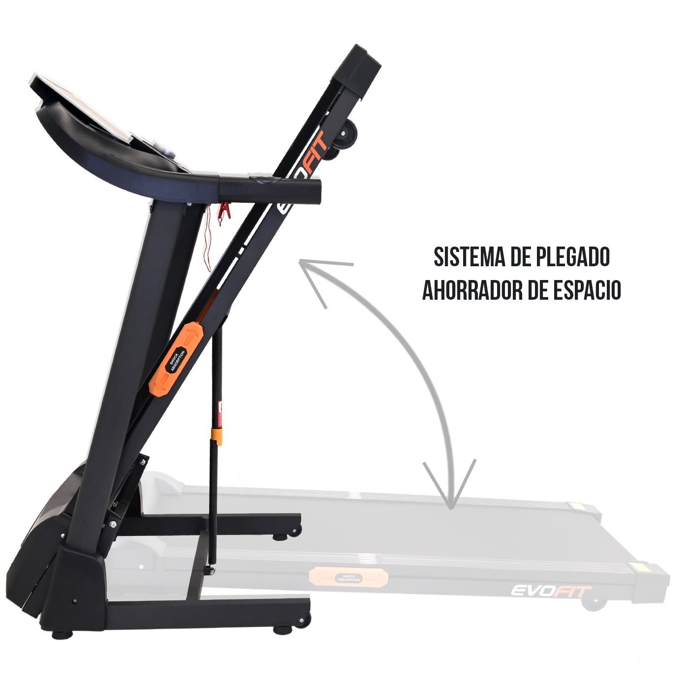 ¡Transforma tu entrenamiento con la trotadora EVOFIT! Equipada con un motor DC de 2.5 HP y una velocidad máxima de 14 km/h, te permite monitorear tiempo, velocidad, distancia, calorías, pulso e inclinación en su display digital. Disfruta de 15 niveles de inclinación digital y el sensor cardíaco integrado para un control preciso de tu rendimiento. Su sistema de plegado ahorrador de espacio y área de trote de 130 x 44 cm la hacen ideal para cualquier lugar. Soporta un peso máximo de usuario de 100 kg, brindando un entrenamiento seguro y eficiente. ¡Haz de la EVOFIT tu aliada para un estilo de vida más saludable!